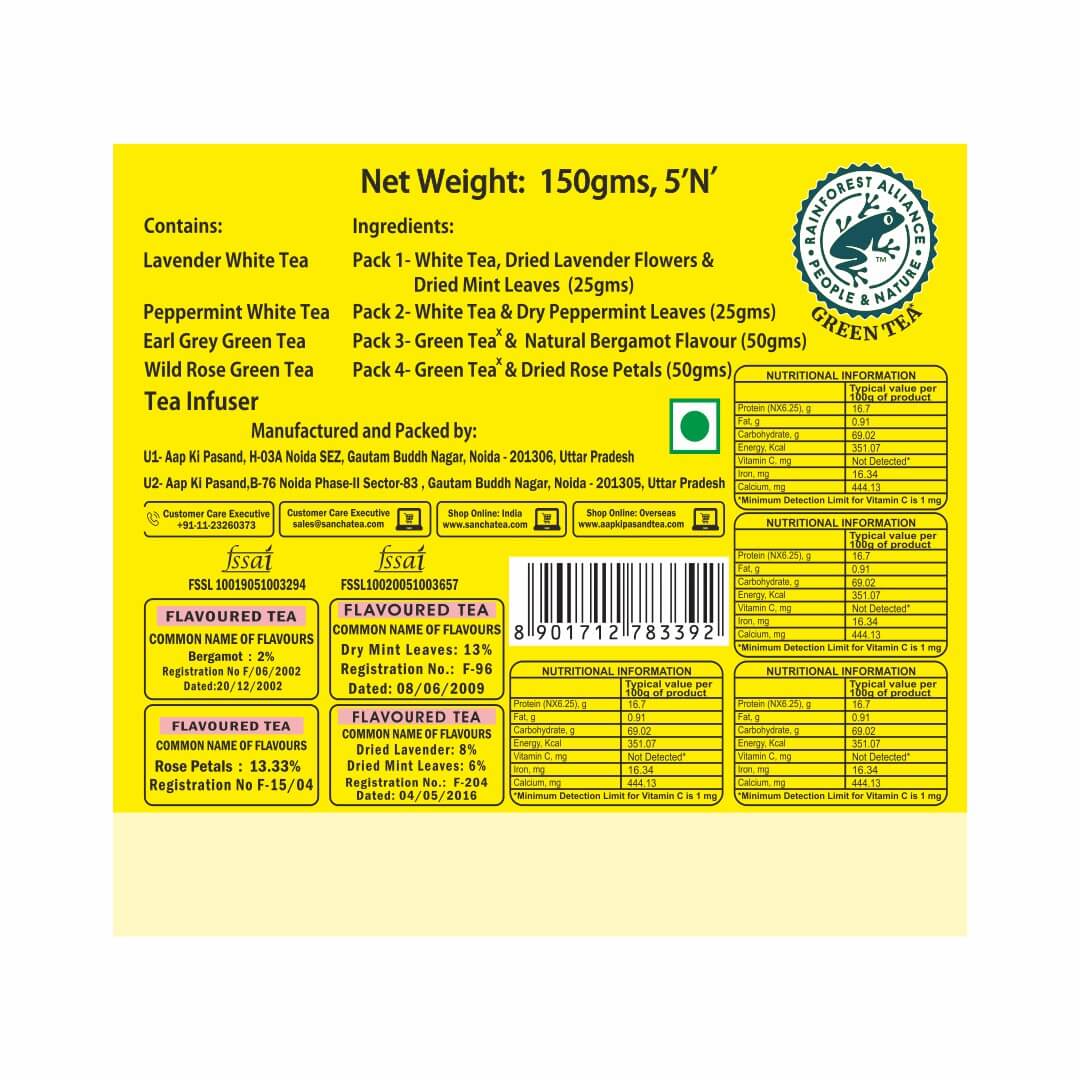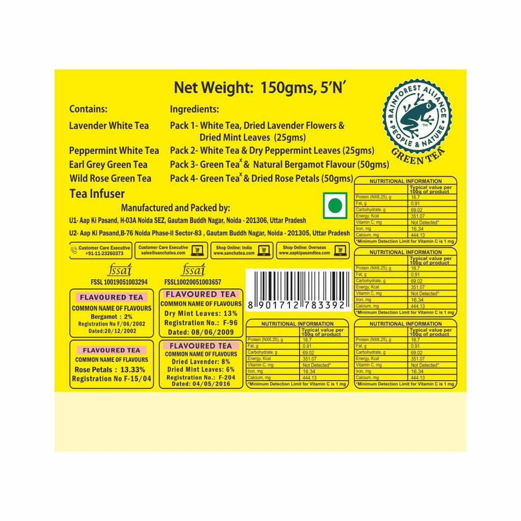 A celebration of India’s finest aromatics, the Grand Indulgence Collection brings together four exceptional teas that embody the artistry of SANCHA’s blending tradition — Lavender White Tea, Peppermint White Tea, Earl Grey Green Tea, and Wild Rose Green Tea, accompanied by a handcrafted tea infuser for the perfect brew.