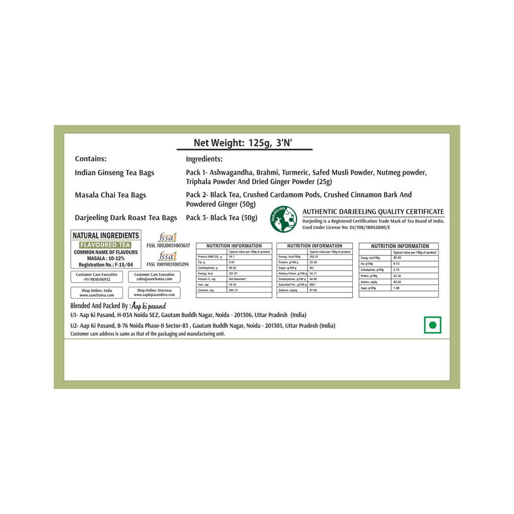A luxurious gift selection celebrating India’s most iconic teas — the aromatic Dark Roast Darjeeling, the spiced Masala Chai, and the revitalizing Indian Ginseng Tea.