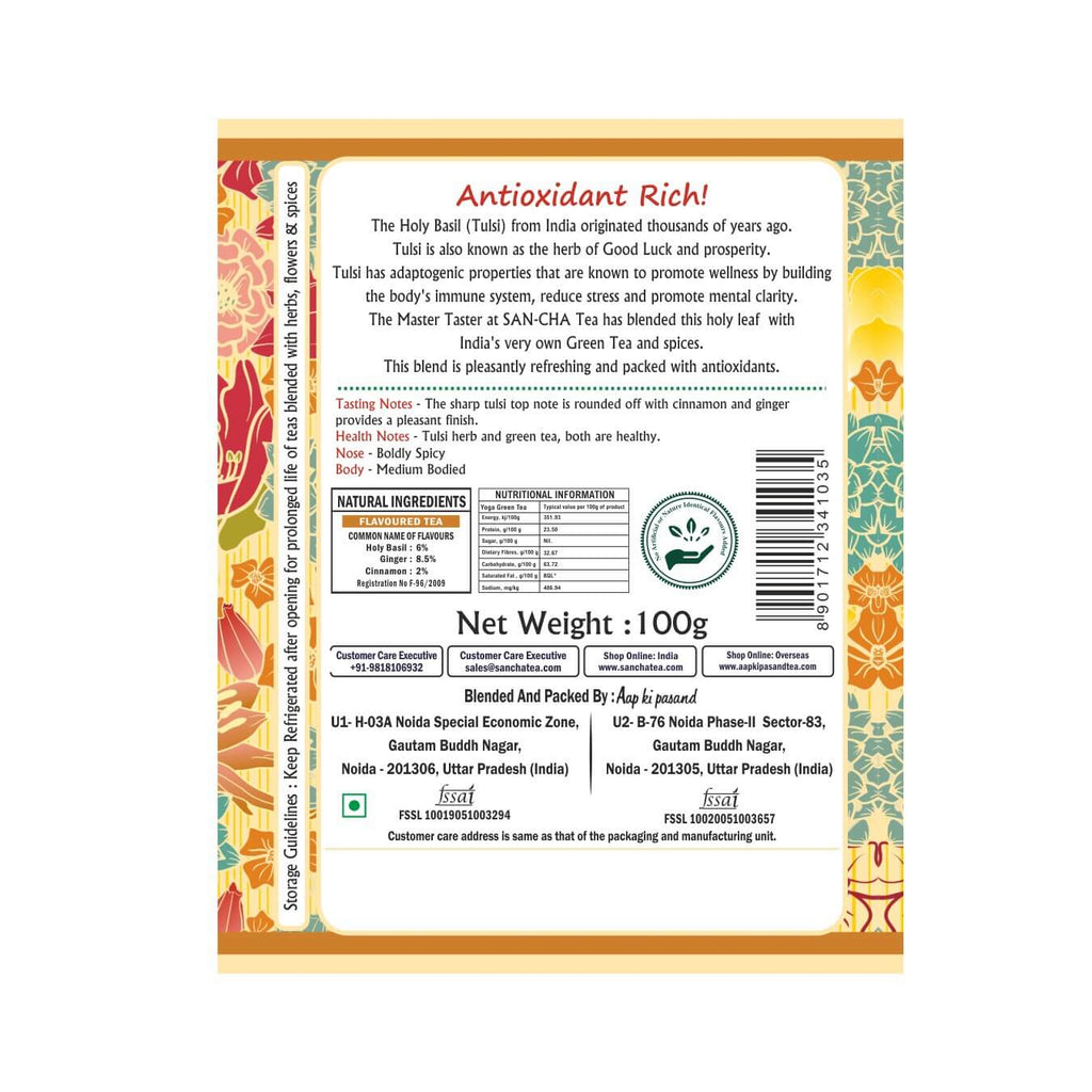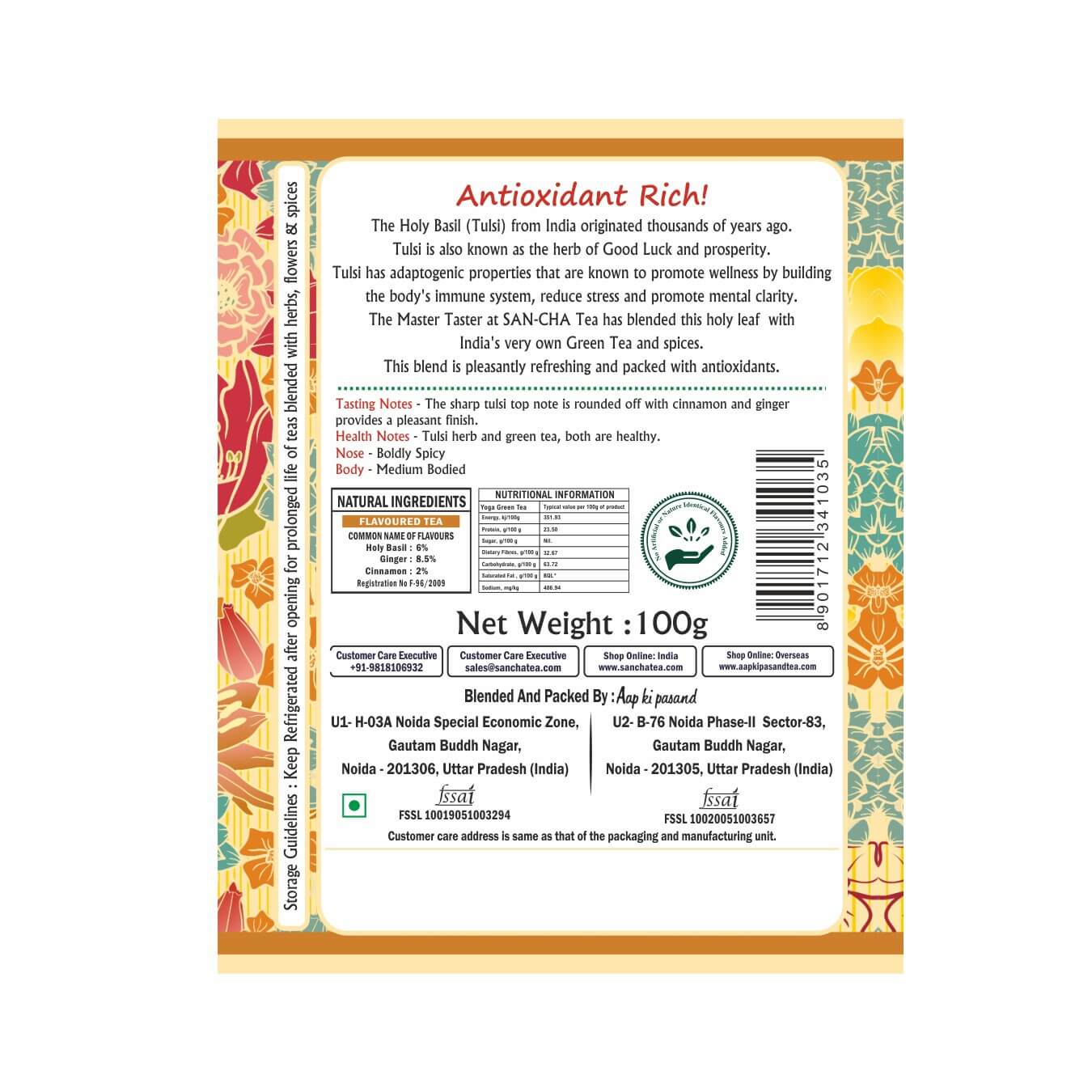 Green Tea, Dried Holy Basil Leaves, Crushed Cinnamon Bark & Crushed Ginger Powder