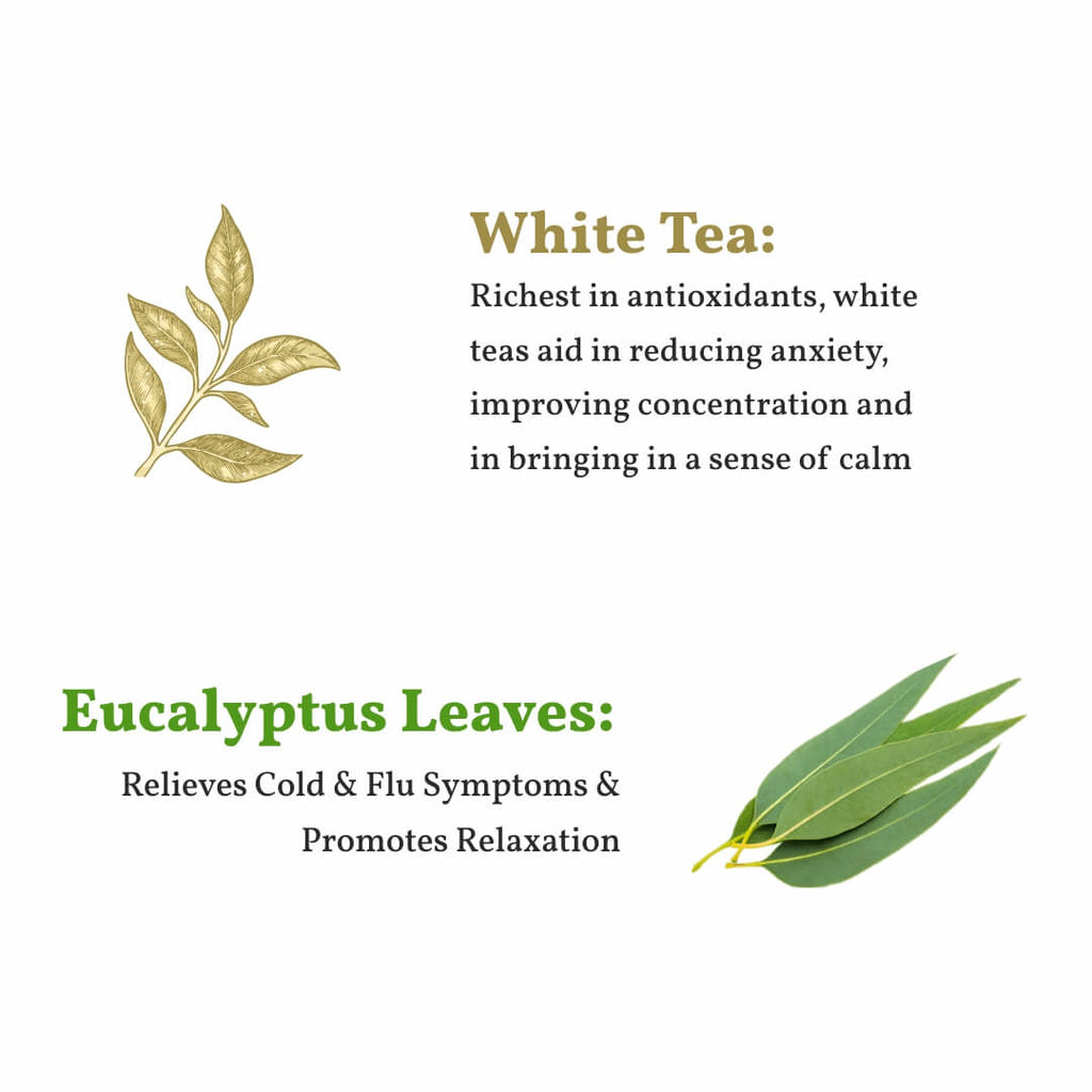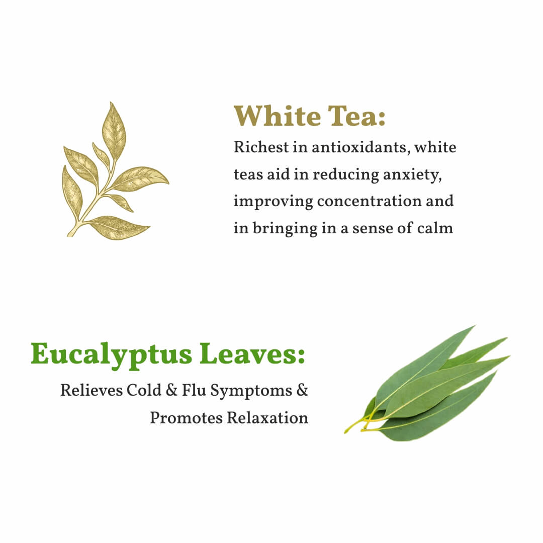 The Lemon Eucalyptus White Tea is a rare and refreshing creation, blending the delicate buds of Silver Needle White Tea with the crisp freshness of eucalyptus leaves and a zesty touch of lemon.