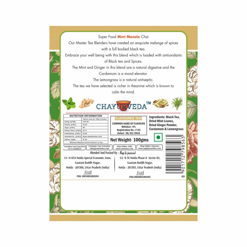 Black Teas, dried mint masala chai, dried ginger powder, cardamom & lemongrass